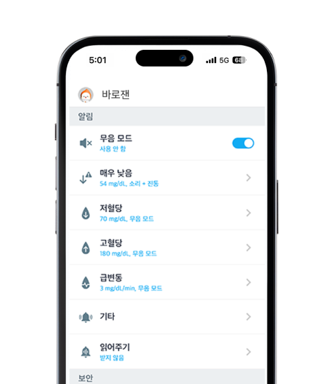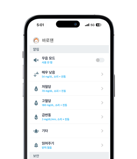 설정에서 매우 낮음, 저혈당, 고혈당, 급변동 알림 기준을 변경할 수 있습니다.