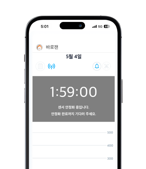 혈당 알림과 급변동 알림 등 설정이 완료되면 30분의 센서 안정화가 시작됩니다.