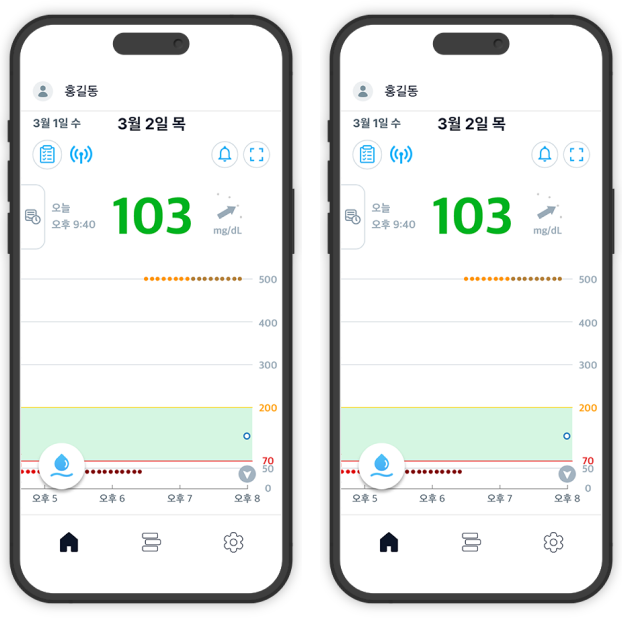 그래프 내 표기된 이벤트는 혈당 변화 추이를 분석하는 데에 도움이 됩니다. 메뉴 중간에 사람 아이콘을 누르면 연결된 다른 센서 사용자의 데이터도 볼 수 있습니다.